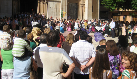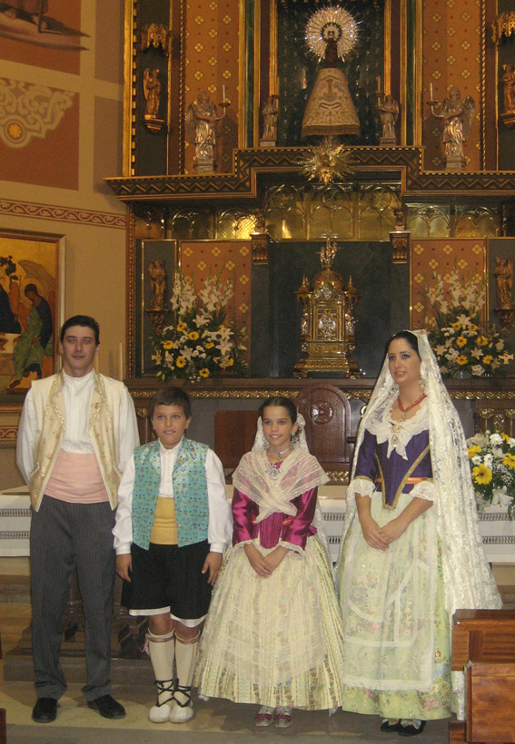 Vicente Javier, Alvaro, Lourdes Mª e Irene posando frente a la imagen de la Virgen del Pilar al término de la misa en su honor celebrada en la Iglesia de la Santísima Trinidad. Momento en el que Lourdes Mª, Álvaro, Irene y Vicente Javier entraban en la Iglesia. Diversos momentos de los bailes tradicionales en la Plaza Escuelas Pias |