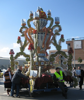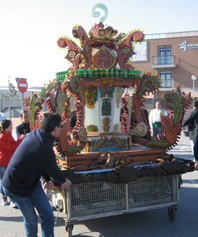 Lunes por la tarde, afortunadamente con sol, sacando las gaiatas del almacén donde se han construido para participar en el desfile de gaiatas suspendido el domingo por lluvia.