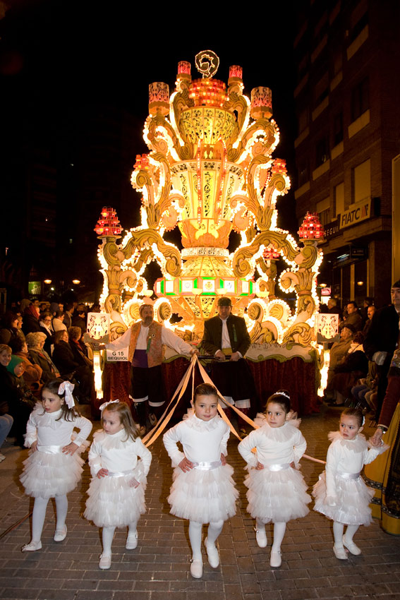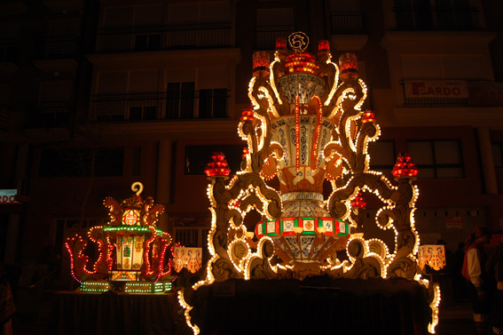 Pruebas de iluminación antes de anochecer y que de comienzo el desfile.