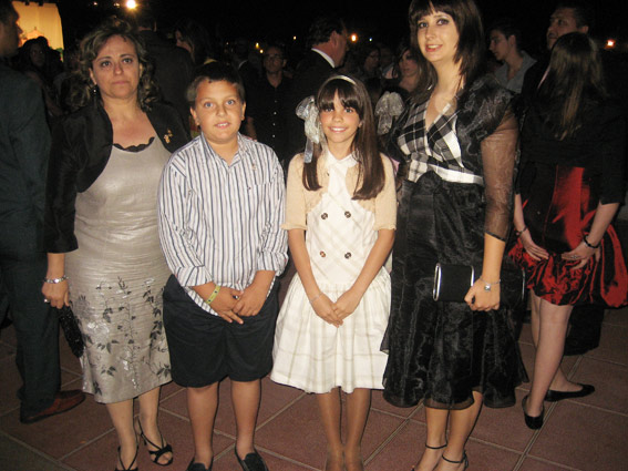 Elisabeth, Alvaro, Lourdes Mª e Irene en la presentación de las reinas del Grao Camino de la lonja tras la presentación El sábado 19 de junio le llegó el turno al distrito marítimo de Castellón de comenzar sus fiestas patronales en honor de San Pedro con la presentación de la Reina del Grao Paula Pérez García y Reina Infantil del Grao Lidia Gómez Vicente y sus cortes de honor. Nuestros representantes de 2010 Irene Lerma, Lourdes Mª Climent, Alvaro Voltes y Elisabeth Breva acudieron junto con el resto de gaiatas para acompañar a la gaiata 12 en esa noche tan especial. Tras la presentación la comitiva se dirigió a la lonja para proseguir la fiesta. |